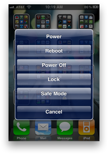 “A simple utility to put your device into MobileSubstrate Safe Mode. You now no longer have to have SBSettings to put your device into Safe Mode! Useful if you want to uninstall a troublesome MobileSubstrate Addon.In SBSettings, Safe Mode can be initiated through the “Power” option. Safe Mode is listed alongside all of the other Power options.